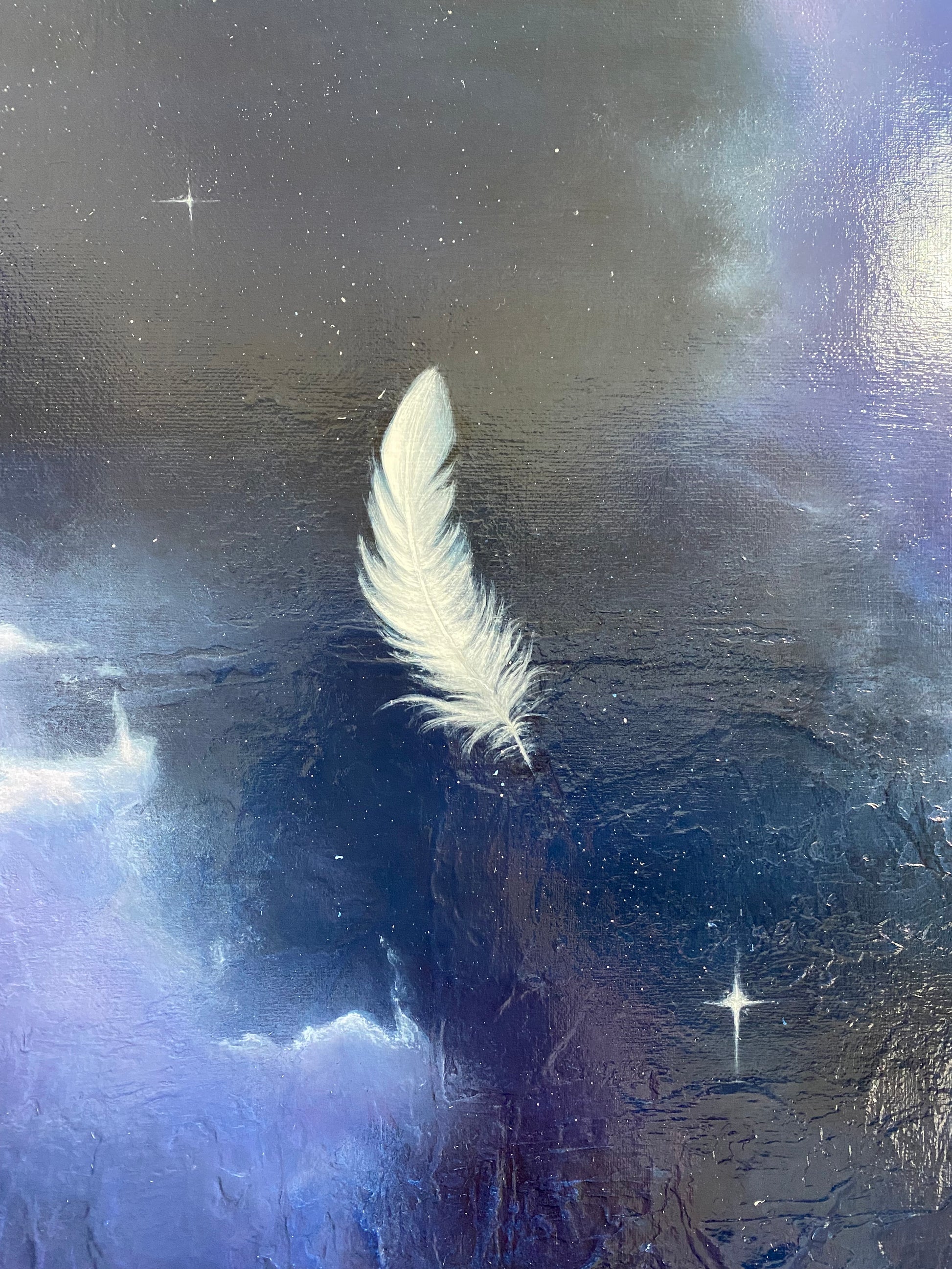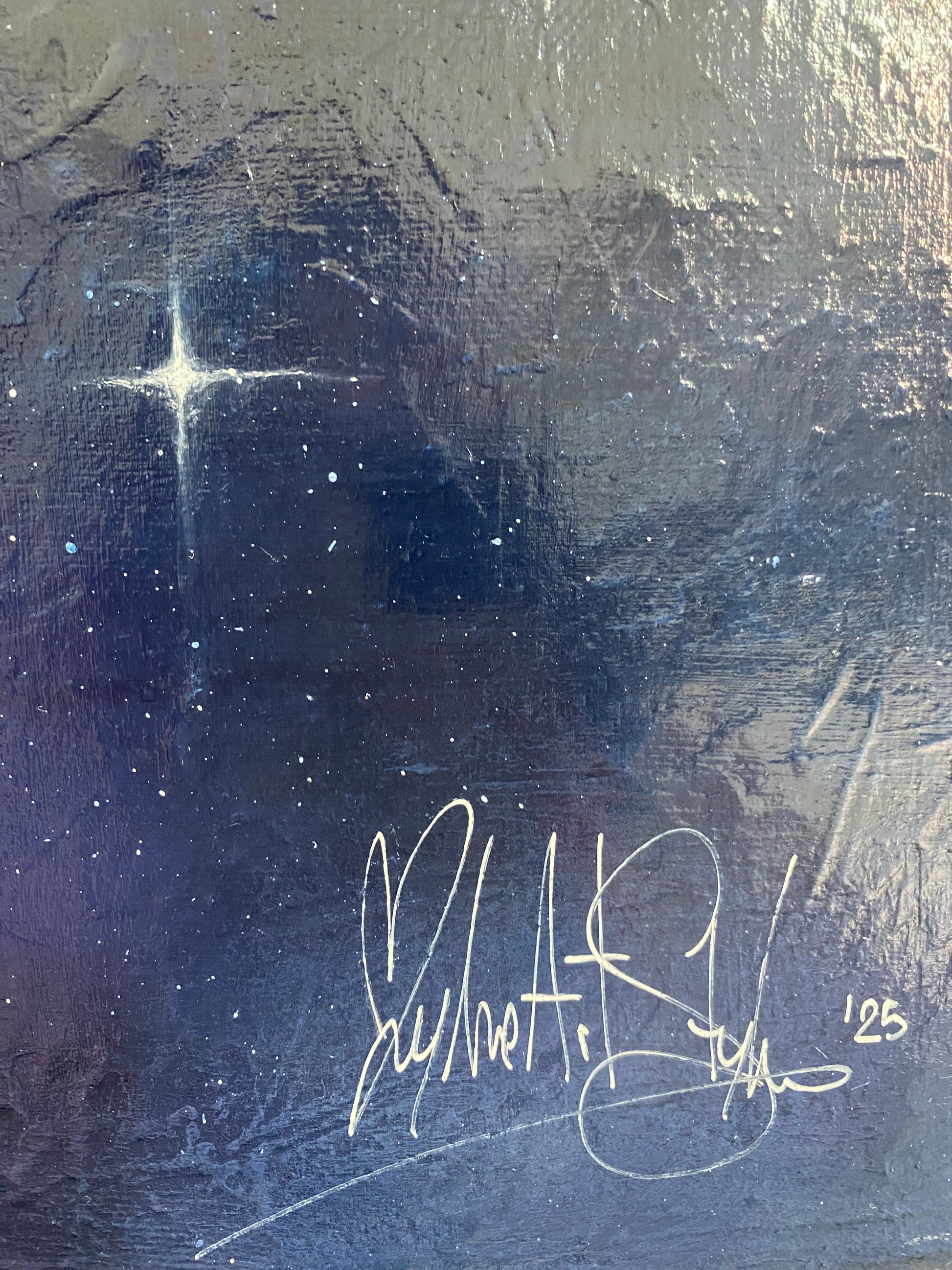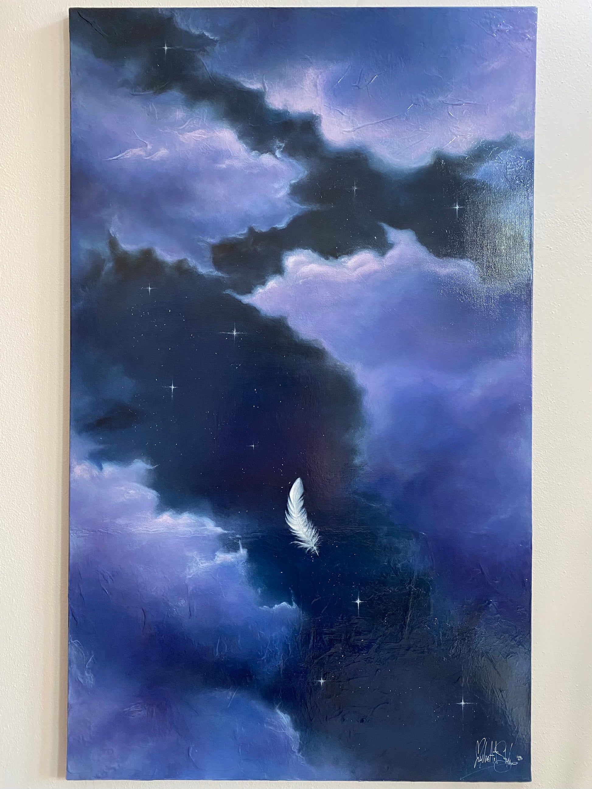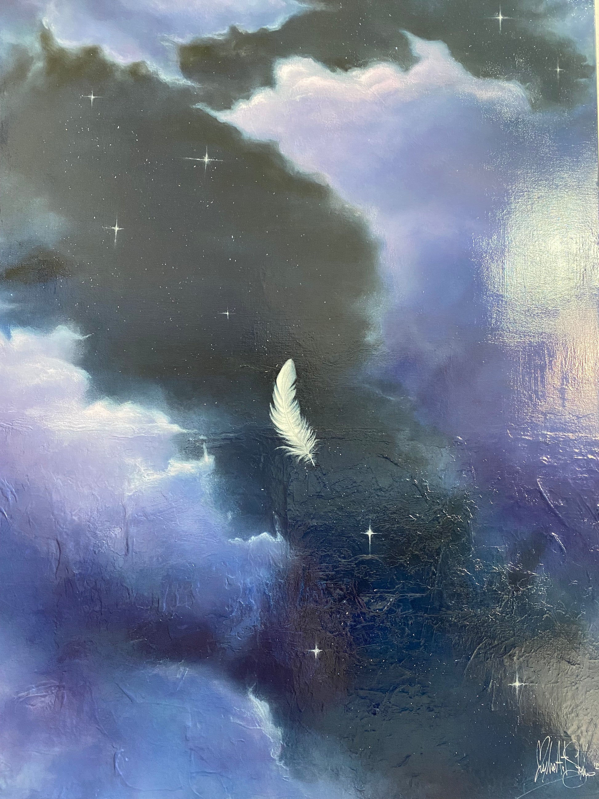 I PROMISE YOU… questa la scritta…poi l’ho riportata al bianco e l’ho osservata, ed è in quel momento che ho scelto di dipingere quello stesso cielo che vedo nella mia mente ogni volta che sogno di guardare un cielo pieno di stelle ed esprimere un desiderio, lo stesso cielo che immagino nei miei libri preferiti e che mi fà sognare che la magia sia reale.